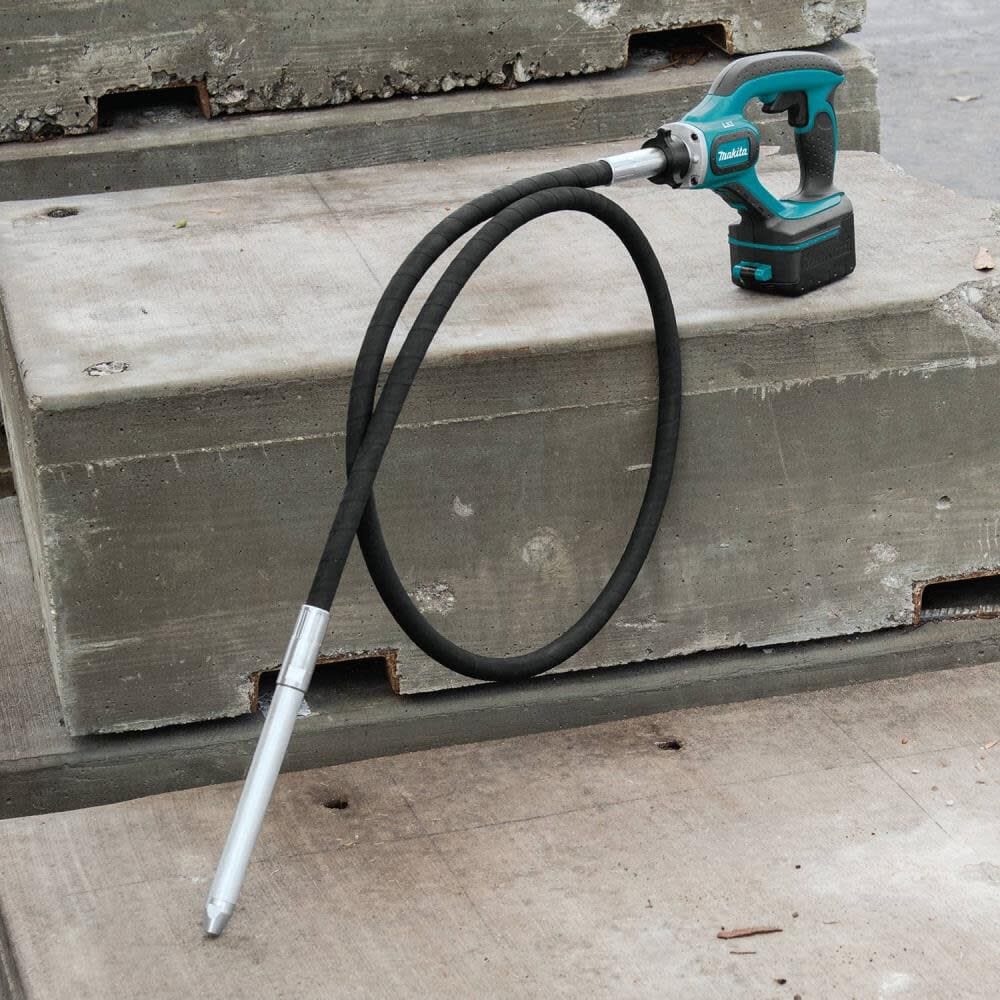 Concrete vibrator features Makita built motor that delivers 12,500 VPM and up to 41 min of run time under load to help increase strength of concrete. It has dual directional switch that conveniently holds the tool in both horizontal and vertical positions. Tool powered by an 18 Volt Lithium-Ion slide style battery assures fastest charge time, more working time and minimal sitting time on the charger.